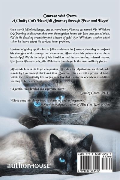 Courage with Paws: A Chatty Cat's Heartfelt Journey through Fear and Hope! In a world full of challenges, one extraordinary Siamese cat named Sir Whiskers McPurrington discovers that even the mightiest hearts can face unexpected trials. With his dazzling creativity and a heart of gold, Sir Whiskers is taken aback when he learns about his serious heart problem. Instead of giving up, this brave feline embraces the journey, choosing to confront his struggles with courage and cleverness. How does this gutsy cat rise above hardship? With the help of his intuition and the enchanting wizard doctor, Professor Pawsworth, Sir Whiskers finds hope in the most unlikely places. Alongside him is his loyal companion, Barkley the Australian shepherd, who stands by him through thick and thin. Together, they unveil a powerful truth: within their pawsitivity lies not just nine lives but a universe of endless possibilities waiting to be explored. "A gentle, multileveled and enjoyable story." - Stanley Coren, Ph.D. "I love cats; this clever book is charming and unforgettable." - Stephen Spignesi, author of The Cat Book of Lists Making headway...Got the #1 banner in Cardiology, ranked in Children's Cat Books, Cat Care, Cardiovascular Diseases, Pet Care, and more. We will do Book 2 in Jan. Choosing artwork. Darling tale about an old woman with a new orange tabby...he must fill big paws because she tells him stories of her past orange cats and he's afraid he may not measure up. So cute. Sir Great Gatsby.