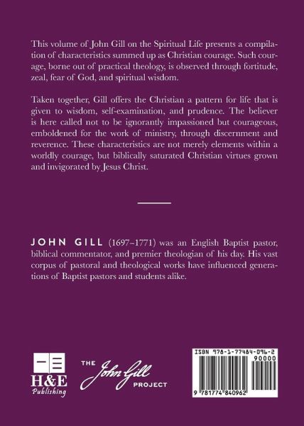This volume of John Gill on the Spiritual Life presents a compilation of characteristics summed up as Christian courage. Such courage, borne out of practical theology, is observed through fortitude, zeal, fear of God, and spiritual wisdom. Taken together, Gill offers the Christian a pattern for life that is given to wisdom, self-examination, and prudence. The believer is here called not to be ignorantly impassioned but courageous, emboldened for the work of ministry, through discernment and reverence. These characteristics are not merely elements within a worldly courage, but biblically saturated Christian virtues grown and invigorated by Jesus Christ.