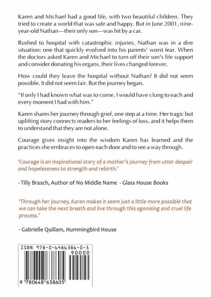 Karen and Michael had a good life, with two beautiful children. They tried to create a world that was safe and happy. But in June 2001, nine-year-old Nathan-their only son-was hit by a car. Rushed to hospital with catastrophic injuries, Nathan was in a dire situation; one that quickly evolved into his parents' worst fear. When the doctors asked Karen and Michael to turn off their son's life support and consider donating his organs, their lives changed forever. How could they leave the hospital without Nathan? It did not seem possible. It did not seem fair. But the journey began. "If only I had known what was to come, I would have clung to each and every moment I had with him." Karen shares her journey through grief, one step at a time. Her tragic but uplifting story connects readers to her feelings of loss, and it helps them to understand that they are not alone. Courage gives insight into the wisdom Karen Lang has learned and the practices she embraces to open each door and to see a way through.
