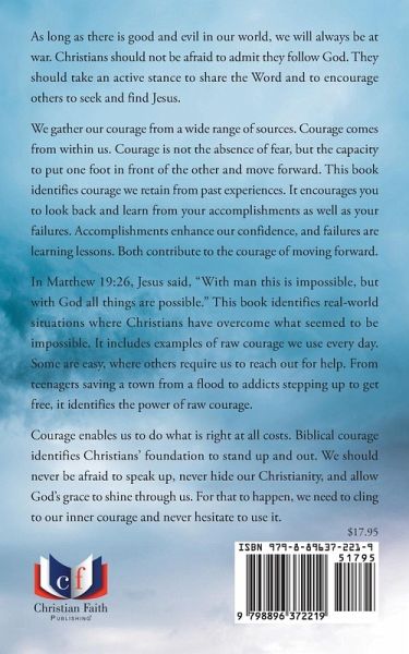As long as there is good and evil in our world, we will always be at war. Christians should not be afraid to admit they follow God. They should take an active stance to share the Word and to encourage others to seek and find Jesus. We gather our courage from a wide range of sources. Courage comes from within us. Courage is not the absence of fear, but the capacity to put one foot in front of the other and move forward. This book identifies courage we retain from past experiences. It encourages you to look back and learn from your accomplishments as well as your failures. Accomplishments enhance our confidence, and failures are learning lessons. Both contribute to the courage of moving forward. In Matthew 19:26, Jesus said, "With man this is impossible, but with God all things are possible." This book identifies real-world situations where Christians have overcome what seemed to be impossible. It includes examples of raw courage we use every day. Some are easy, where others require us to reach out for help. From teenagers saving a town from a flood to addicts stepping up to get free, it identifies the power of raw courage. Courage enables us to do what is right at all costs. Biblical courage identifies Christians' foundation to stand up and out. We should never be afraid to speak up, never hide our Christianity, and allow God's grace to shine through us. For that to happen, we need to cling to our inner courage and never hesitate to use it.