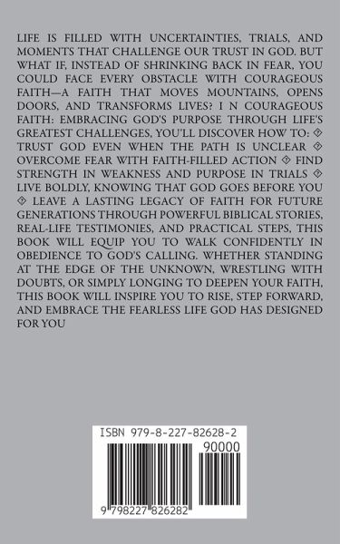 LIFE IS FILLED WITH UNCERTAINTIES, TRIALS, AND MOMENTS THAT CHALLENGE OUR TRUST IN GOD. BUT WHAT IF, INSTEAD OF SHRINKING BACK IN FEAR, YOU COULD FACE EVERY OBSTACLE WITH COURAGEOUS FAITH-A FAITH THAT MOVES MOUNTAINS, OPENS DOORS, AND TRANSFORMS LIVES? I N COURAGEOUS FAITH: EMBRACING GOD'S PURPOSE THROUGH LIFE'S GREATEST CHALLENGES, YOU'LL DISCOVER HOW TO: ¿ TRUST GOD EVEN WHEN THE PATH IS UNCLEAR ¿ OVERCOME FEAR WITH FAITH-FILLED ACTION ¿ FIND STRENGTH IN WEAKNESS AND PURPOSE IN TRIALS ¿ LIVE BOLDLY, KNOWING THAT GOD GOES BEFORE YOU ¿ LEAVE A LASTING LEGACY OF FAITH FOR FUTURE GENERATIONS THROUGH POWERFUL BIBLICAL STORIES, REAL-LIFE TESTIMONIES, AND PRACTICAL STEPS, THIS BOOK WILL EQUIP YOU TO WALK CONFIDENTLY IN OBEDIENCE TO GOD'S CALLING. WHETHER STANDING AT THE EDGE OF THE UNKNOWN, WRESTLING WITH DOUBTS, OR SIMPLY LONGING TO DEEPEN YOUR FAITH, THIS BOOK WILL INSPIRE YOU TO RISE, STEP FORWARD, AND EMBRACE THE FEARLESS LIFE GOD HAS DESIGNED FOR YOU