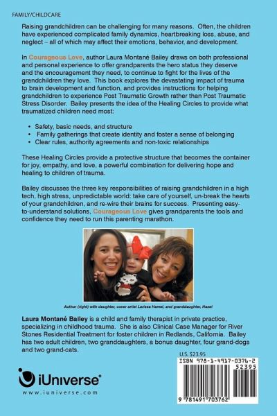 Raising grandchildren can be challenging for many reasons. Often, the children have experienced complicated family dynamics, heartbreaking loss, abuse, and neglect – all of which may affect their emotions, behavior, and development. In Courageous Love, author Laura Montané Bailey draws on both professional and personal experience to offer grandparents the hero status they deserve and the encouragement they need, to continue to fight for the lives of the grandchildren they love. This book explores the devastating impact of trauma to brain development and function, and provides instructions for helping grandchildren to experience Post Traumatic Growth rather than Post Traumatic Stress Disorder. Bailey presents the idea of the Healing Circles to provide what traumatized children need most: • Safety, basic needs, and structure • Family gatherings that create identity and foster a sense of belonging • Clear rules, authority agreements and non-toxic relationships These Healing Circles provide a protective structure that becomes the container for joy, empathy, and love, a powerful combination for delivering hope and healing to children of trauma. Bailey discusses the three key responsibilities of raising grandchildren in a high tech, high stress, unpredictable world: take care of yourself, un-break the hearts of your grandchildren, and re-wire their brains for success. Presenting easy-to-understand solutions, Courageous Love gives grandparents the tools and confidence they need to run this parenting marathon.