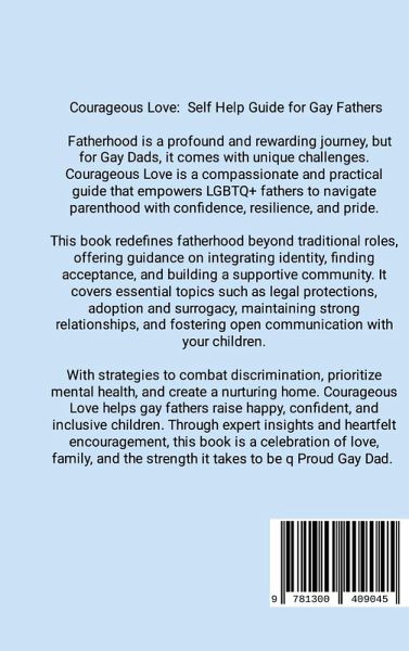 Fatherhood is a profound and rewarding journey, but for gay dads, it comes with unique challenges. Courageous Love is a compassionate and practical guide that empowers LGBTQ+ fathers to navigate parenthood with confidence, resilience, and pride. This book redefines fatherhood beyond traditional roles, offering guidance on integrating identity, finding acceptance, and building a supportive community. It covers essential topics such as legal protections, adoption and surrogacy, maintaining strong relationships, and fostering open communication with your children. With strategies to combat discrimination, prioritize mental health, and create a nurturing home, Courageous Love helps gay fathers raise happy, confident, and inclusive children. Through expert insights and heartfelt encouragement, this book is a celebration of love, family, and the strength it takes to be a Proud Gay Dad.I'm