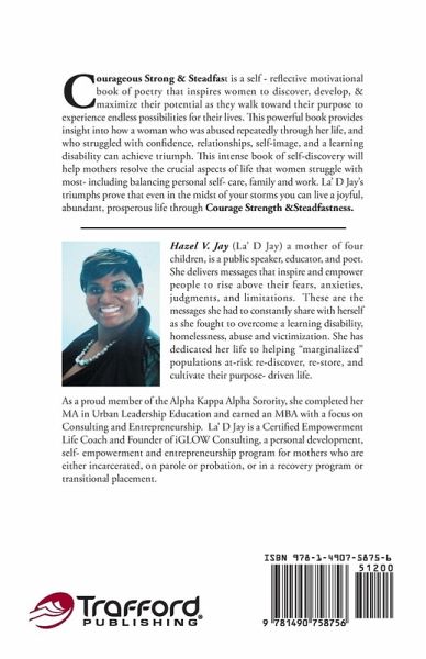 Courageous Strong & Steadfast is a self - reflective motivational book of poetry that inspires women to discover, develop, & maximize their potential as they walk toward their purpose to experience endless possibilities for their lives. This powerful book provides insight into how a woman who was abused repeatedly through her life, and who struggled with confi dence, relationships, self-image, and a learning disability can achieve triumph. This intense book of self discovery will help mothers resolve the crucial aspects of life that women struggle with most- including balancing personal self- care, family and work. La' D Jay's triumphs prove that even in the midst of your storms you can live a joyful, abundant, prosperous life through Courage Strength &Steadfastness.