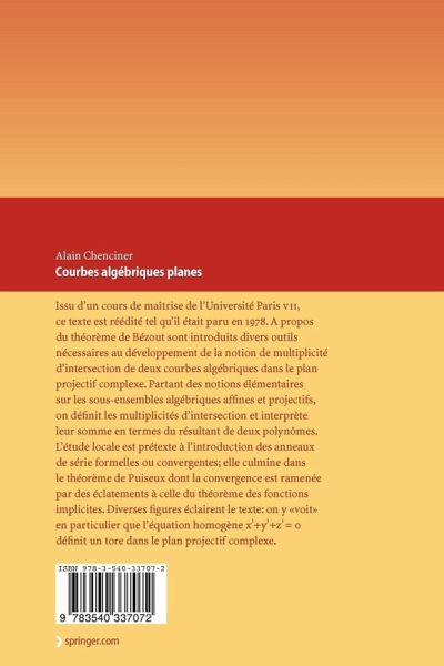 From the reviews: "The book contains an introduction to the theory of algebraic plane curves, in a form suitable for a first course in Algebraic Geometry at undergraduate/graduate level. ... Using the basic properties of polynomial rings, the author introduces algebraic sets in the plane, irreducible components and local analysis by means of localisations of the coordinate rings. ... the author presents the local theory of singularities and intersection multiplicities, using as his basic tool the Puiseux expansions at a point." (Luca Chiantini, Zentralblatt MATH, Vol. 1133 (11), 2008)