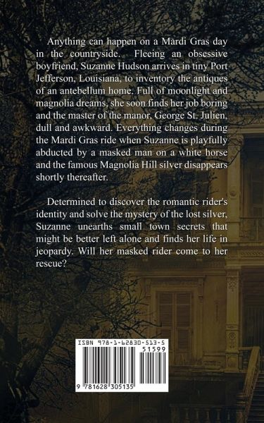Anything can happen on a Mardi Gras day in the countryside. Fleeing an obsessive boyfriend, Suzanne Hudson arrives in tiny Port Jefferson, Louisiana, to inventory the antiques of an antebellum home. Full of moonlight and magnolia dreams, she soon finds her job boring and the master of the manor, George St. Julien, dull and awkward. Everything changes during the Mardi Gras ride when Suzanne is playfully abducted by a masked man on a white horse and the famous Magnolia Hill silver disappears shortly thereafter. Determined to discover the romantic rider's identity and solve the mystery of the lost silver, Suzanne unearths small town secrets that might be better left alone and finds her life in jeopardy. Will her masked rider come to her rescue?