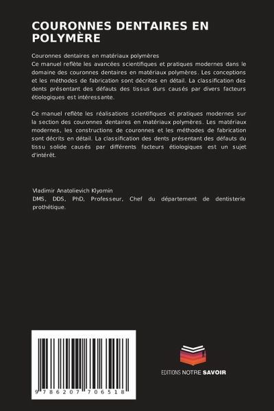 Couronnes dentaires en matériaux polymères Ce manuel reflète les avancées scientifiques et pratiques modernes dans le domaine des couronnes dentaires en matériaux polymères. Les conceptions et les méthodes de fabrication sont décrites en détail. La classification des dents présentant des défauts des tissus durs causés par divers facteurs étiologiques est intéressante.Ce manuel reflète les réalisations scientifiques et pratiques modernes sur la section des couronnes dentaires en matériaux polymères. Les matériaux modernes, les constructions de couronnes et les méthodes de fabrication sont décrits en détail. La classification des dents présentant des défauts du tissu solide causés par différents facteurs étiologiques est un sujet d'intérêt.