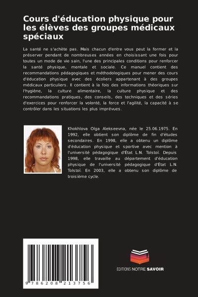 La santé ne s'achète pas. Mais chacun d'entre vous peut la former et la préserver pendant de nombreuses années en choisissant une fois pour toutes un mode de vie sain, l'une des principales conditions pour renforcer la santé physique, mentale et sociale. Ce manuel contient des recommandations pédagogiques et méthodologiques pour mener des cours d'éducation physique avec des écoliers appartenant à des groupes médicaux particuliers. Il contient à la fois des informations théoriques sur l'hygiène, la culture alimentaire, la culture physique et des recommandations pratiques, des conseils, des techniques et des séries d'exercices pour renforcer la volonté, la force et l'agilité, la capacité à se contrôler dans les situations les plus imprévues.