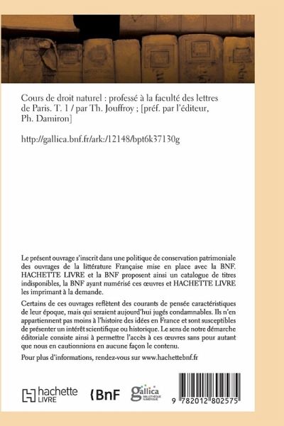 Cours de droit naturel: professe a la faculte des lettres de Paris. T. 1 / par Th. Jouffroy; [pref. par l'editeur, Ph. Damiron]Date de l'edition originale: 1843Sujet de l'ouvrage: Droit naturelCe livre est la reproduction fidele d'une oeuvre publiee avant 1920 et fait partie d'une collection de livres reimprimes a la demande editee par Hachette Livre, dans le cadre d'un partenariat avec la Bibliotheque nationale de France, offrant l'opportunite d'acceder a des ouvrages anciens et souvent rares issus des fonds patrimoniaux de la BnF.Les oeuvres faisant partie de cette collection ont ete numerisees par la BnF et sont presentes sur Gallica, sa bibliotheque numerique.En entreprenant de redonner vie a ces ouvrages au travers d'une collection de livres reimprimes a la demande, nous leur donnons la possibilite de rencontrer un public elargi et participons a la transmission de connaissances et de savoirs parfois difficilement accessibles.Nous avons cherche a concilier la reproduction fidele d'un livre ancien a partir de sa version numerisee avec le souci d'un confort de lecture optimal. Nous esperons que les ouvrages de cette nouvelle collection vous apporteront entiere satisfaction.Pour plus d'informations, rendez-vous sur www.hachettebnf.frhttp: //gallica.bnf.fr/ark: /12148/bpt6k37130g