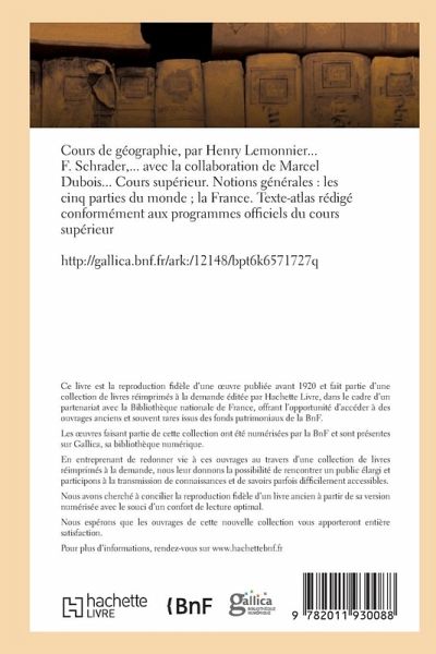 Cours de géographie, par Henry Lemonnier... F. Schrader, ... avec la collaboration de Marcel Dubois... Cours supérieur. Notions générales: les cinq parties du monde; la France. Texte-atlas rédigé conformément aux programmes officiels du cours supérieur des écoles primaires... avec la collaboration de L. Galdouedec, ... 8e édition entièrement refondue (175e mille) Date de l'édition originale: 1911 Le présent ouvrage s'inscrit dans une politique de conservation patrimoniale des ouvrages de la littérature Française mise en place avec la BNF. HACHETTE LIVRE et la BNF proposent ainsi un catalogue de titres indisponibles, la BNF ayant numérisé ces oeuvres et HACHETTE LIVRE les imprimant à la demande. Certains de ces ouvrages reflètent des courants de pensée caractéristiques de leur époque, mais qui seraient aujourd'hui jugés condamnables. Ils n'en appartiennent pas moins à l'histoire des idées en France et sont susceptibles de présenter un intérêt scientifique ou historique. Le sens de notre démarche éditoriale consiste ainsi à permettre l'accès à ces oeuvres sans pour autant que nous en cautionnions en aucune façon le contenu. Pour plus d'informations, rendez-vous sur www.hachettebnf.fr