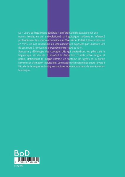 Le « Cours de linguistique générale » de Ferdinand de Saussure est une oeuvre fondatrice qui a révolutionné la linguistique moderne et influencé profondément les sciences humaines au XXe siècle. Publié à titre posthume en 1916, ce livre rassemble les idées novatrices exposées par Saussure lors de ses cours à l'Université de Genève entre 1906 et 1911. Saussure y développe des concepts clés qui deviendront les piliers de la linguistique structurale. Il introduit la distinction cruciale entre langue et parole, définissant la langue comme un système de signes et la parole comme son utilisation individuelle. Cette approche systémique ouvre la voie à l'étude de la langue en tant que structure, indépendamment de son évolution historique. L'auteur propose une théorie révolutionnaire du signe linguistique, composé du signifiant (image acoustique) et du signifié (concept), liés de manière arbitraire. Cette notion d'arbitraire du signe remet en question les conceptions naturalistes du langage et pose les bases de la sémiologie, science générale des signes dont la linguistique fait partie. Le « Cours » s'inscrit naturellement dans les catégories « Linguistique », « Philosophie du langage » et « Sciences humaines ». Saussure y introduit également la distinction entre synchronie (étude de la langue à un moment donné) et diachronie (étude de son évolution), ouvrant ainsi de nouvelles perspectives pour l'analyse linguistique. L'ouvrage aborde en profondeur la notion de valeur linguistique, soulignant que le sens des mots découle de leurs relations au sein du système de la langue plutôt que de leur référence au monde extérieur. Cette approche relationnelle a eu un impact considérable sur le développement du structuralisme dans diverses disciplines.