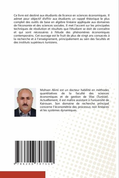 Ce livre est destiné aux étudiants de licence en sciences économiques. Il admet pour objectif d'offrir aux étudiants un rappel théorique le plus complet des outils de base en algèbre linéaire appliquée aux domaines de l'économie et des sciences sociales. Il met l'accent sur les principales techniques de résolution et résultats que l'étudiant se doit de connaître et qui sont nécessaires à l'étude des phénomènes économiques contemporains. Cet ouvrage est le fruit de plus de vingt ans consacrés à la recherche et à l'enseignement, principalement au sein des facultés et des instituts supérieurs tunisiens.