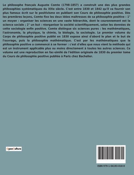 Imaginez un monde où la science et la philosophie s'entrelacent pour offrir une compréhension progressive de l'univers. C'est précisément ce que propose Auguste Comte dans son ' Cours de Philosophie Positive Vol.2 '. Ce volume, publié au XIXe siècle, s'inscrit dans une époque de bouleversements intellectuels et sociaux, où la quête de savoir et de progrès scientifique est au cur des préoccupations. Comte, figure majeure du positivisme, s'attache à démontrer comment les sciences peuvent être organisées de manière hiérarchique, chaque discipline reposant sur les fondations de la précédente, pour aboutir à une progression cohérente de la connaissance humaine. Dans cet ouvrage, Comte explore les sciences fondamentales telles que la biologie et la sociologie, qu'il considère comme les piliers de la compréhension des phénomènes naturels et sociaux. Il met en lumière l'importance de l'observation et de l'expérimentation, rejetant les spéculations métaphysiques au profit d'une approche empirique. Ce texte se distingue par son organisation à structurer la pensée scientifique, offrant ainsi un cadre méthodologique rigoureux pour l'étude des lois qui régissent notre monde. Les thématiques abordées par Comte, telles que l'évolution des sociétés humaines et le rôle de la science dans le progrès social, résonnent encore aujourd'hui. En proposant une classification des sciences et en soulignant l'interdépendance entre elles, Comte nous invite à réfléchir sur la manière dont le savoir peut être utilisé pour améliorer la condition humaine. Ce livre nous enseigne que la connaissance, lorsqu'elle est ordonnée et systématisée, devient un outil puissant pour comprendre et transformer notre environnement.