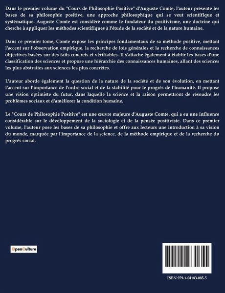 Dans le premier volume du "Cours de Philosophie Positive" d'Auguste Comte, l'auteur présente les bases de sa philosophie positive, une approche philosophique qui se veut scientifique et systématique. Auguste Comte est considéré comme le fondateur du positivisme, une doctrine qui cherche à appliquer les méthodes scientifiques à l'étude de la société et de la nature humaine. Dans ce premier tome, Comte expose les principes fondamentaux de sa méthode positive, mettant l'accent sur l'observation empirique, la recherche de lois générales et la recherche de connaissances objectives basées sur des faits concrets et vérifiables. Il s'attache également à établir les bases d'une classification des sciences et propose une hiérarchie des connaissances humaines, allant des sciences les plus abstraites aux sciences les plus concrètes. L'auteur aborde également la question de la nature de la société et de son évolution, en mettant l'accent sur l'importance de l'ordre social et de la stabilité pour le progrès de l'humanité. Il propose une vision optimiste du futur, dans laquelle la science et la raison permettront de résoudre les problèmes sociaux et d'améliorer la condition humaine. Le "Cours de Philosophie Positive" est une ¿uvre majeure d'Auguste Comte, qui a eu une influence considérable sur le développement de la sociologie et de la pensée positiviste. Dans ce premier volume, l'auteur pose les bases de sa philosophie et offre aux lecteurs une introduction à sa vision du monde, marquée par l'importance de la science, de la méthode empirique et de la recherche du progrès social.