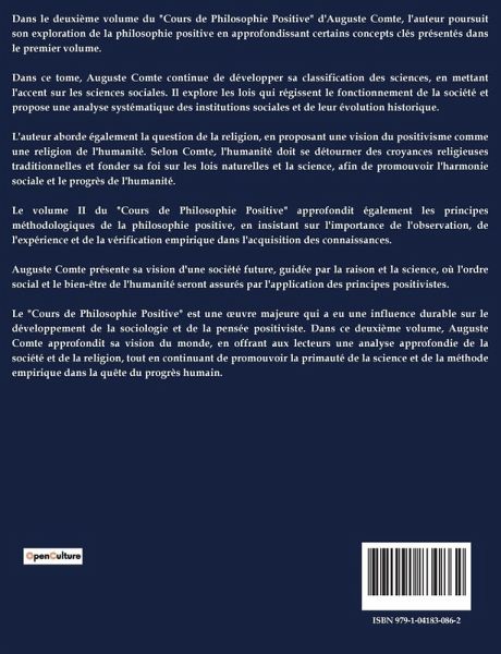 Dans le dernier volume de son "Cours de philosophie positive", Auguste Comte aborde les défis personnels et professionnels qu'il a rencontrés tout au long de l'élaboration de son uvre. Comte explique que la publication de son traité a été retardée par des obstacles personnels, parmi lesquels des difficultés financières et des conflits avec des éditeurs, ainsi que par des crises de santé. Il souligne également l'importance de son indépendance intellectuelle, qu'il a maintenue malgré les pressions des institutions académiques et des courants philosophiques dominants de son époque. Comte critique les influences théologiques et métaphysiques qui, selon lui, entravent le progrès de la pensée positive. Il exprime sa frustration face à l'opposition qu'il rencontre de la part des institutions académiques, y compris l'Académie des Sciences, qui, selon lui, ne reconnaissent pas pleinement la valeur de ses contributions. Comte appelle à une reconnaissance plus large de son travail et à un soutien pour ses projets futurs, soulignant que sa démarche philosophique vise à établir une base solide pour la compréhension scientifique et sociale. Il conclut en affirmant que son uvre est essentielle pour le passage vers une société guidée par la raison et la science, plutôt que par des croyances dépassées.