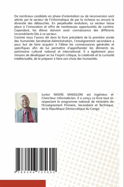 De nombreux candidats en phase d'orientation ou de reconversion sont attirés par le secteur de l'informatique de par la richesse ou encore la diversité des débouchés. En perpétuelle évolution, ce secteur laisse place à l'innovation et offre de nombreuses opportunités de carrière. Cependant, les élèves doivent avoir connaissance des différents inconvénients liés à ce secteur.Comme nous l'avons dit dans le livre précédent de la première année des humanités Secrétariat-Administration, l'enseignement secondaire a pour but de faire acquérir à l'élève les connaissances générales et spécifiques afin de lui permettre d'appréhender les éléments du patrimoine culturel national et international. Il a également pour mission de développer en lui l'esprit critique, la créativité et la curiosité intellectuelle, de le préparer à faire son choix des humanités.