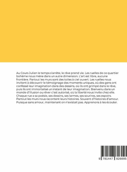 Au Cours Julien le temps s'arrête, le rêve prend vie. Les ruelles de ce quartier bohème nous mène dans un autre dimension. L'art est libre, aucune frontière. Partout les murs sont des toiles à ciel ouvert. Les ruelles nous invitent à découvrir le témoignage des moments uniques, où des gens ont confessé leur imagination dans des dessins, où ils ont grimpé dans le rêve, puis ils ont immortalisé un instant de leur imagination. Bienvenu dans un monde d'illusion ou rêver c'est autorisé, où la liberté nous invite chez elle. Chaque rue a sa poésie, ses dessins, ses larmes, ses sourires, ses espoirs. Partout les murs nous racontent leurs histoires. Souvent d'histoires d'amour. Puisque sans amour, maintenant on n'existait pas. Apprenons à les écouter.