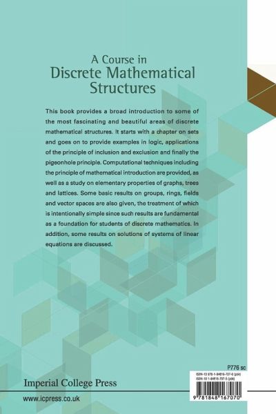 The book provides a broad introduction to some of the fascinating and beautiful areas of Discrete Mathematical Structures. It starts with a chapter on sets, gives some beautiful examples in logic, a nice presentation of the Principal of mathematical introduction, after giving some nice things about computational techniques goes on to study elementary propertities of graphs, trees and lattices. It also provides some basic results on groups, rings, fields and vector spaces- the treatment of these topics is extremely elementary and only such results are included as are absolutely necessary for the students. Some results on solutions of systems of linear equations are also discussed.