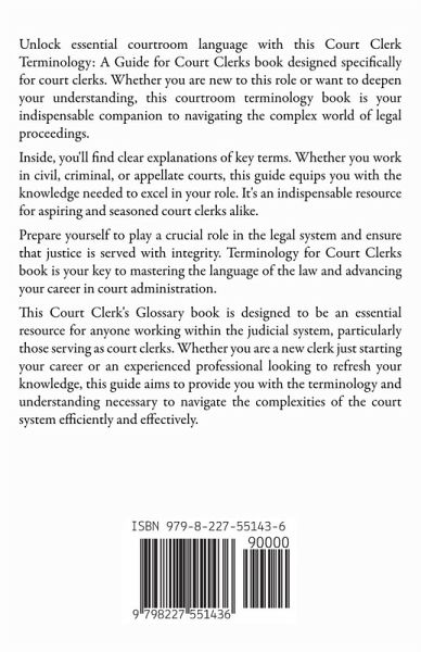 Unlock essential courtroom language with this Court Clerk Terminology: A Guide for Court Clerks book designed specifically for court clerks. Whether you are new to this role or want to deepen your understanding, this courtroom terminology book is your indispensable companion to navigating the complex world of legal proceedings. Inside, you'll find clear explanations of key terms. Whether you work in civil, criminal, or appellate courts, this guide equips you with the knowledge needed to excel in your role. It's an indispensable resource for aspiring and seasoned court clerks alike. Prepare yourself to play a crucial role in the legal system and ensure that justice is served with integrity. Terminology for Court Clerks book is your key to mastering the language of the law and advancing your career in court administration. This Court Clerk's Glossary book is designed to be an essential resource for anyone working within the judicial system, particularly those serving as court clerks. Whether you are a new clerk just starting your career or an experienced professional looking to refresh your knowledge, this guide aims to provide you with the terminology and understanding necessary to navigate the complexities of the court system efficiently and effectively.