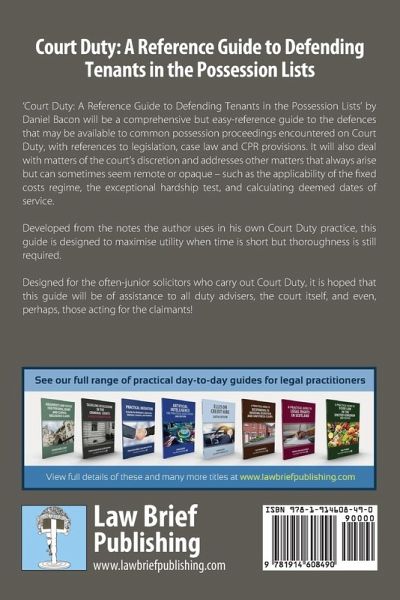 'Court Duty: A Reference Guide to Defending Tenants in the Possession Lists' by Daniel Bacon will be a comprehensive but easy-reference guide to the defences that may be available to common possession proceedings encountered on Court Duty, with references to legislation, case law and CPR provisions. It will also deal with matters of the court's discretion and addresses other matters that always arise but can sometimes seem remote or opaque - such as the applicability of the fixed costs regime, the exceptional hardship test, and calculating deemed dates of service. Developed from the notes the author uses in his own Court Duty practice, this guide is designed to maximise utility when time is short but thoroughness is still required. Designed for the often-junior solicitors who carry out Court Duty, it is hoped that this guide will be of assistance to all duty advisers, the court itself, and even, perhaps, those acting for the claimants! ABOUT THE AUTHOR Daniel Bacon is a solicitor at Duncan Lewis Solicitors in the City of London who specialises in housing law. He regularly acts as Court Duty adviser defending tenants on the possession lists. He also acts for landlords on a private basis. He holds a Master of Laws (LLM) from the University of Law. CONTENTS Chapter One - General Discretion of the Court and Possible Orders Chapter Two - Security of Tenure Chapter Three - Reasonableness of Making a Possession Order Chapter Four - Deemed Date of Service of the NOSP Chapter Five - Actual Service of the NOSP Chapter Six - Personal Service of the NOSP Chapter Seven - Raising a Defence of Set Off Against Arrears Chapter Eight - Gas Safety Records and the Validity of a Section 21 Notice Chapter Nine - The Exceptional Hardship Test Chapter Ten - Costs Chapter Eleven - Introduction to Defences Chapter Twelve - General Defences - Standing - Conduct of the Litigation and Rights of Audience - Particularisation of the Claim - Court Forms Used - Verification by Statement of Truth - Covid Notice - Service of the Nosp - Limitation - Form and Substance of the Nosp - Notice Period - Lack of Capacity - Equality Act Defences Chapter Thirteen - Section 21 Specific Defences - Service of the NOSP in the First 4 Months of the AST - Expiry of the NOSP and / or Issue of Proceedings Within the Contractual Period - The How to Rent Guide - Gas Safety Record - Energy Performance Certificate - Deposit Protection and Prescribed Information - Improvement Notice From the Local Authority - Licensing Requirements (Selective Licensing for Rental Properties) - Licensing Requirements (Houses in Multiple Occupation) - Prohibited Fees Chapter Fourteen - Section 8 (The Rent Arrears Grounds) Specific Defences - Making Out Grounds 8, 10, and 11 - Section 48 Notice - Defence of Set-Off by Way of a Counterclaim: Disrepair / Housing Conditions - Begin Here if You Are Short of Time - Defence of Set-Off by Way of a Counterclaim: Deposit Protection / Service of Prescribed Information - Defence of Set-Off by Way of a Counterclaim: Breaches of the Equality Act (Discrimination and Harassment)