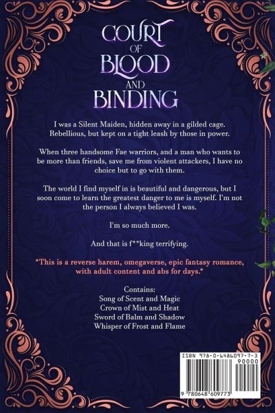 I was a Silent Maiden, hidden away in a gilded cage. Rebellious, but kept on a tight leash by those in power. When three handsome Fae warriors, and a man who wants to be more than friends, save me from violent attackers, I have no choice but to go with them. The world I find myself in is beautiful and dangerous, but I soon come to learn the greatest danger to me is myself. I'm not the person I always believed I was. I'm so much more. And that is f**king terrifying. **This is a reverse harem, omegaverse, epic fantasy romance, with adult content and abs for days.** Contains: Song of Scent and Magic Crown of Mist and Heat Sword of Balm and Shadow Whisper of Frost and Flame