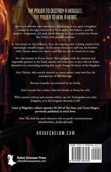 THE POWER TO DESTROY A KINGDOM THE POWER TO HEAL A HEART Ari's new powers have awakened, threatening to tear apart a kingdom already on the edge. Sent back to Valon to face her father's-and the people's-judgement, Ari must decide how far she'll go to reclaim her former life, if that's even possible anymore. In the heart of the turmoil, Iata, the reigning ruler, is losing control of his increasingly unstable magics. As his secrets threaten to spill out, his brother's wife, Haneri, draws ever closer-and he's not sure he wants her to stop. At the border to Kidaa Space, Rhys grapples with the ominous and impossible patterns in the Kidaa attacks, and comes face to face with the Kidaa themselves in a harrowing meeting that could change the future of the kingdom. And Dressa, who secretly married an enemy prince, must now face the consequences of that marriage. Because Lesander was activated by her family. And Lesander has a choice: obey her family, or betray her wife. With enemies without and enemies within, can the Truthspoken save their kingdom, or is this kingdom doomed to fall? Court of Magickers collects episodes 94-150 of The Stars and Green Magics, previously published in serial form on Kindle Vella. Note: This book has main characters who use gender-neutral pronouns (they/them/their, fae/faer/faerself).