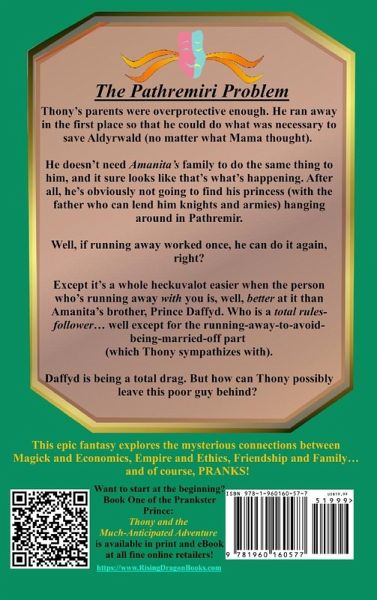 Prince Thony has quickly realized that Amanita's homeland is not where he needs to be - but the matriarchy doesn't want to let him go. So, he has to run away again, this time taking Amanita's brother, Prince Daffyd with him, and heading to the Land of Snow-Fairies, where Puck's mom is the Queen... and a Goddess... ********** Thony's parents were overprotective enough. He ran away in the first place so that he could do what was necessary to save Aldyrwald (no matter what Mama thought). He doesn't need Amanita's family to do the same thing to him, and it sure looks like that's what's happening. After all, he's obviously not going to find his princess (with the father who can lend him knights and armies) hanging around in Pathremir. Well, if running away worked once, he can do it again, right? Except it's a whole heckuvalot easier when the person who's running away with you is, well, better at it than Amanita's brother, Prince Daffyd. Who is a total rules-follower... well except for the running-away-to-avoid-being-married-off part (which Thony sympathizes with). Daffyd is being a total drag. But how can Thony possibly leave this poor guy behind? This epic fantasy explores the mysterious connections between Magick and Economics, Empire and Ethics, Friendship and Family... and of course, PRANKS! Want to start at the beginning? Book One of the Prankster Prince: Thony and the Much-Anticipated Adventure is available in print and eBook at all fine online retailers! ******** Teaser: Thony winced. "NOT. I'm not interested in anyone, guy or girl. I don't have the right to be interested," he began. "Your Big Quest, yadda, yadda, yadda," Daffyd rolled his eyes. "It's to find someone to marry you, right?" "A princess," Thony clarified. "Whose dad will lend me his army to protect Aldyrwald." "Someone," Daffyd corrected. "And how much of an 'army' do you need anyways? A dozen knights and maybe a couple hundred regular troops? Or the equivalent?" Thony blinked. He hadn't actually thought about numbers. "About that, I suppose," he admitted, after thinking about it for a moment. "More wouldn't hurt, though." It wasn't likely there was anyone in the Mountain-Region who would know how to manage terribly large forces. "You think too much," Daffyd said as Thony ruminated on these new ideas. And then Thony found himself being kissed without asking. Again. And it was still the same problem. He didn't want to hurt Daffyd. He just wanted to be asked. (Well, and for his 'no' to be properly respected.)