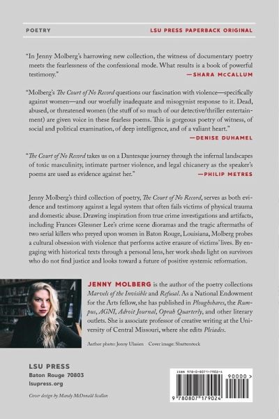 Jenny Molberg's third collection of poetry, The Court of No Record, serves as both evidence and testimony against a legal system that often fails victims of physical trauma and domestic abuse. Drawing inspiration from true crime investigations and artifacts, including Frances Glessner Lee's crime scene dioramas and the tragic aftermaths of two serial killers who preyed upon women in Baton Rouge, Louisiana, Molberg probes a cultural obsession with violence that performs active erasure of victims' lives. By engaging with historical texts through a personal lens, she sheds light on survivors who do not find justice and looks toward a future of positive systemic reformation.