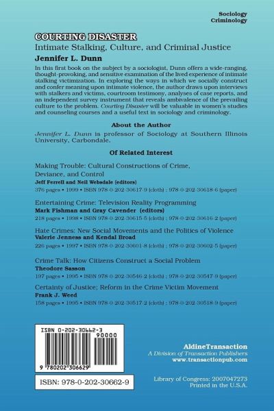 This book is about women who are coerced, intimidated, and stalked by former intimates. It is about the things these women do to manage this situation, and what happens to them as a consequence. Stalking is a behavior that has relatively recently been defined as problematic, and as criminal when violence or the threat of violence occurs. This new category of crime has created a new type of victim. How such victims come into being, interact with their former partners, and seek help, is the subject of this book. It is also about living through what some women consider a form of secondary victimization by the criminal justice system.The definition of someone as a victim is not self-evident, but is contingent upon interpretation. Thus this book is also an account of how women come to decide they are victims of stalking and seek to convince others of this. It uses a variety of data and methods to examine this phenomenon from the perspectives of both victims and law enforcement agents, and adds to our understanding of responsibility and blame when violence occurs between intimates. By examining social constructions of this particular type of victimization and the choices stalking victims make, the readers learn more about the forces constraining human decisions. Stalking victimization is complicated because it is an ongoing process. It often does not stop once the criminal justice system is involved. Women who are being stalked by their former partners face a profound dilemma in their efforts to manage their pursuers and to pursue their cases through the criminal justice system. Dunn offers a wide-ranging, thought-provoking, and sensitive examination of the lived experience of intimate stalking victimization. In exploring the ways in which we socially construct and confer meaning upon intimate violence, the author draws upon interviews with stalkers and victims, courtroom testimony, analyses of case reports, and an independent survey instrument that reveals ambivalence of the prevailing culture to the problem. Courting Disaster will be valuable in women's studies and counseling courses and a useful text in sociology and criminology.