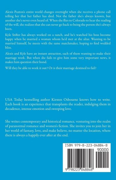 Alexis Paxton's entire world changes overnight when she receives a phone call telling her that her father has died. Not the father she's always known, but another she's never even heard of. When she flies to Colorado to hear the reading of the will, she realizes that she can never go back to being the person she's always been. Kyle Stifter has always worked on a ranch, and he's watched his boss become happy when he married a woman whom he'd met at the altar. Wanting to be married himself, he meets with the same matchmaker, hoping to find wedded bliss. Alexis and Kyle have an instant attraction, each of them wanting to make their marriage work. But when she fails to give him some very important news, it makes him question their bond. Will they be able to work it out? Or is their marriage destined to fail?