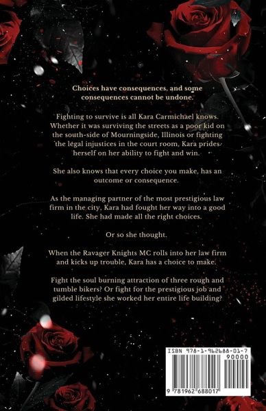 Choices have consequences, and some consequences cannot be undone. Fighting to survive is all Kara Carmichael knows. Whether it was surviving the streets as a poor kid on the south-side of Mourningside, Illinois or fighting the legal injustices in the court room, Kara prides herself on her ability to fight and win. She also knows that every choice you make, has an outcome or consequence. As the managing partner of the most prestigious law firm in the city, Kara had fought her way into a good life. She had made all the right choices. Or so she thought. When the Ravager Knights MC rolls into her law firm and kicks up trouble, Kara has a choice to make. Fight the soul burning attraction of three rough and tumble bikers? Or fight for the prestigious job and gilded lifestyle she worked her entire life building?