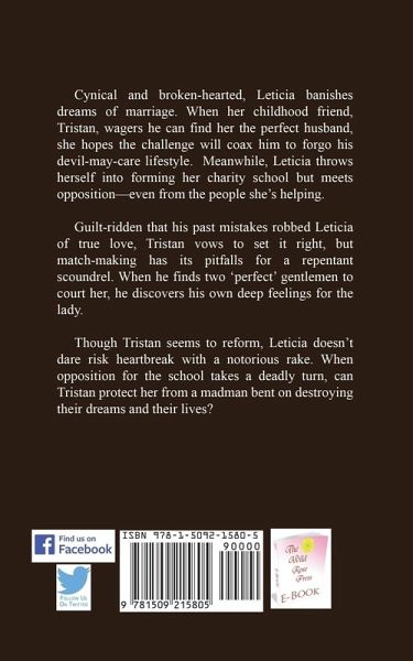 Cynical and broken-hearted, Leticia banishes dreams of marriage. When her childhood friend, Tristan, wagers he can find her the perfect husband, she hopes the challenge will coax him to forgo his devil-may-care lifestyle. Meanwhile, Leticia throws herself into forming her charity school but meets opposition—even from the people she’s helping. Guilt-ridden that his past mistakes robbed Leticia of true love, Tristan vows to set it right, but match-making has its pitfalls for a repentant scoundrel. When he finds two ‘perfect’ gentlemen to court her, he discovers his own deep feelings for the lady. Though Tristan seems to reform, Leticia doesn’t dare risk heartbreak with a notorious rake. When opposition for the school takes a deadly turn, can Tristan protect her from a madman bent on destroying their dreams and their lives?