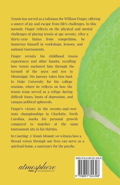 Tennis has served as a talisman for William Finger, offering a source of joy and escape from life's challenges. In this memoir, Finger reflects on the physical and mental challenges of playing tennis at age seventy. After a thirty-year hiatus from competition, he immerses himself in workshops, lessons, and national tournaments. Finger revisits his childhood tennis experiences and other haunts, recalling how tennis anchored him through the turmoil of the 1950s and 60s in Mississippi. His journey takes him back to Duke University for his college reunion, where he reflects on how the tennis team served as a refuge during difficult times, bouts of depression, and campus political upheavals. Finger's victory in the seventy-and-over state championships in Charlotte, North Carolina, marks his personal growth compared to matches at the same tournament site in his thirties. In Courting: A Tennis Memoir, we witness how a thread woven through our lives can serve as a spiritual home, a sanctuary for the psyche.