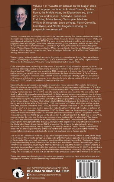 Volume 2 concentrates on trial plays mounted in the twentieth century. The first decade featured notable dramas by Leo Tolstoy (The Living Corpse, Russia, 1900), Alexander Bisson (Madame X, France, 1908), and John Galsworthy (Justice, England, 1910). The trend continued with authors of the main stream penning plays populated with judges, prosecutors, defense attorneys, jurors, witnesses, and the accused, often charged with murder in the first degree -- Elmer Rice, Ayn Rand, Ernst Toller, W. Somerset Maugham, Richard Wright, Maxwell Anderson, and Arthur Miller. Herman Wouk, Jean Genet, Aldous Huxley, William Faulkner, William Saroyan, James Baldwin, Terence Rattigan, Jeffrey Archer, Ariel Dorfman, David Henry Hwang, Aaron Sorkin, others. Veteran mystery writers joined the fray, concocting courtroom melodramas. Among them were Gaston Leroux (The Mystery of the Yellow Room, 1912), A.E.W Mason (No Other Tiger, 1928), Agatha Christie Witness for the Prosecution, 1953), and Henry Cecil (Settled Out of Court, 1960). Quite a few plays were inspired by real-life events. Caponsacchi (1926) is based on a poem by Robert Browning, depicting a double murder among the clergy in Rome of 1698. Sophie Treadwell's expressionist drama Machinal (1928) focuses on a sensational 1927 murder case in Queens, New York, in which an ordinary stenographer kills her much older husband when she feels stifled at home. A Pin to See the Peepshow (1951), by F. Tennyson Jesse and H.M. Harwood, introduces a twenty-eight-year-old London millinery who, with the aid of her younger lover, plans to eliminate a bossy husband. On the evening of October 3, 1922, he is found stabbed to death on a side road. The entries, presented chronologically, include a plot synopsis, production data, opinions by critics, and biographical sketches of playwrights and key actors-directors.