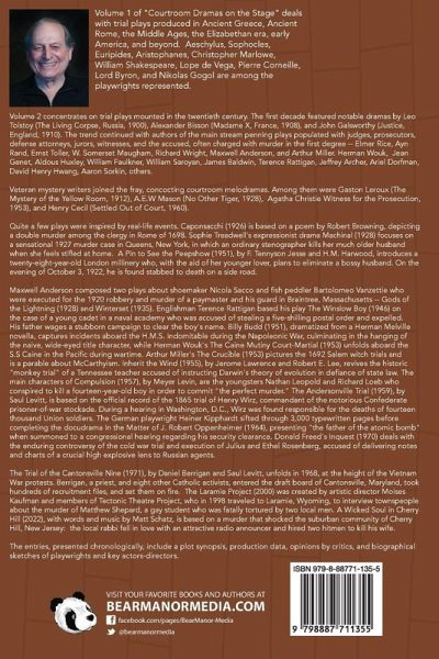 Volume 2 concentrates on trial plays mounted in the twentieth century. The first decade featured notable dramas by Leo Tolstoy (The Living Corpse, Russia, 1900), Alexander Bisson (Madame X, France, 1908), and John Galsworthy (Justice, England, 1910). The trend continued with authors of the main stream penning plays populated with judges, prosecutors, defense attorneys, jurors, witnesses, and the accused, often charged with murder in the first degree -- Elmer Rice, Ayn Rand, Ernst Toller, W. Somerset Maugham, Richard Wright, Maxwell Anderson, and Arthur Miller. Herman Wouk, Jean Genet, Aldous Huxley, William Faulkner, William Saroyan, James Baldwin, Terence Rattigan, Jeffrey Archer, Ariel Dorfman, David Henry Hwang, Aaron Sorkin, others. Veteran mystery writers joined the fray, concocting courtroom melodramas. Among them were Gaston Leroux (The Mystery of the Yellow Room, 1912), A.E.W Mason (No Other Tiger, 1928), Agatha Christie Witness for the Prosecution, 1953), and Henry Cecil (Settled Out of Court, 1960). Quite a few plays were inspired by real-life events. Caponsacchi (1926) is based on a poem by Robert Browning, depicting a double murder among the clergy in Rome of 1698. Sophie Treadwell's expressionist drama Machinal (1928) focuses on a sensational 1927 murder case in Queens, New York, in which an ordinary stenographer kills her much older husband when she feels stifled at home. A Pin to See the Peepshow (1951), by F. Tennyson Jesse and H.M. Harwood, introduces a twenty-eight-year-old London millinery who, with the aid of her younger lover, plans to eliminate a bossy husband. On the evening of October 3, 1922, he is found stabbed to death on a side road. The entries, presented chronologically, include a plot synopsis, production data, opinions by critics, and biographical sketches of playwrights and key actors-directors.