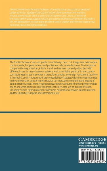 The frontier between 'law' and 'politics' is not always clear-cut. A large area exists where courts operate, but where governments and parliaments also make decisions. Tim Koopmans compares the way American, British, French and German law and politics deal with different issues: in many instances subjects which are highly 'political' in one country constitute legal issues in another. Is there, for example a 'sovereign Parliament' (as there is in Britain), or will courts control the compatibility of statutes with the Constitution (as in the United States and Germany)(?)33; How far can courts go in controlling the legality of administrative action(?)33; Are there general legal theories about the frontier between what courts and what politics can do(?)33; Koopmans considers case law on a range of issues, including human rights protection, federalism, separation of powers, equal protection and the impact of European and international law.