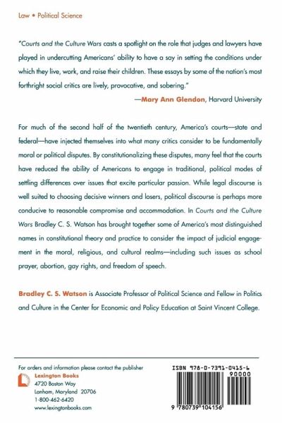 For much of the second half of the twentieth century, America's courts-state and federal-have injected themselves into what many critics consider to be fundamentally moral or political disputes. By constitutionalizing these disputes, many feel that the courts have reduced the ability of Americans to engage in traditional, political modes of settling differences over issues that excite particular passion. While legal discourse is well suited to choosing decisive winners and losers, political discourse is perhaps more conducive to reasonable compromise and accommodation. In Courts and the Culture Wars Bradley C. S. Watson has brought together some of America's most distinguished names in constitutional theory and practice to consider the impact of judicial engagement in the moral, religious, and cultural realms-including such issues as school prayer, abortion, gay rights, and expressive speech.