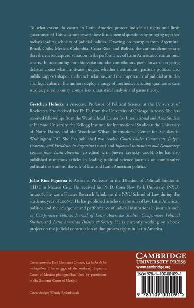 To what extent do courts in Latin America protect individual rights and limit governments? This volume answers these fundamental questions by bringing together today's leading scholars of judicial politics. Drawing on examples from Argentina, Brazil, Chile, Mexico, Colombia, Costa Rica and Bolivia, the authors demonstrate that there is widespread variation in the performance of Latin America's constitutional courts. In accounting for this variation, the contributors push forward ongoing debates about what motivates judges; whether institutions, partisan politics and public support shape inter-branch relations; and the importance of judicial attitudes and legal culture. The authors deploy a range of methods, including qualitative case studies, paired country comparisons, statistical analysis and game theory.