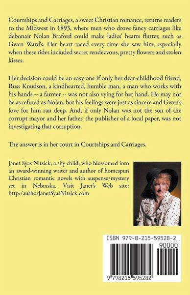 Courtships and Carriages, a sweet Christian romance, returns readers to the Midwest in 1893, where men who drove fancy carriages like debonair Nolan Braford could make ladies' hearts flutter, such as Gwen Ward's. Her heart raced every time she saw him, especially when these rides included secret rendezvous, pretty flowers and stolen kisses. ... Her decision could be an easy one if only her dear-childhood friend, Russ Knudson, a kindhearted, humble man, a man who works with his hands -- a farmer -- was not also vying for her hand. He may not be as refined as Nolan, but his feelings were just as sincere and Gwen's love for him ran deep. And, if only Nolan was not the son of the corrupt mayor and her father, the publisher of a local paper, was not investigating that corruption. The answer is in her court in Courtships and Carriages, which includes intrigue and suspense when a trunkful of mayoral electoral ballots comes up missing.