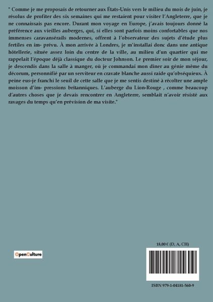 " Comme je me proposais de retourner aux États-Unis vers le milieu du mois de juin, je résolus de profiter des six semaines qui me restaient pour visiter l¿Angleterre, que je ne connaissais pas encore. Durant mon voyage en Europe, j¿avais toujours donné la préférence aux vieilles auberges, qui, si elles sont parfois moins confortables que nos immenses caravansérails modernes, offrent à l¿observateur des sujets d¿étude plus fertiles en im- prévu. À mon arrivée à Londres, je m¿installai donc dans une antique hôtellerie, située assez loin du centre de la ville, au milieu d¿un quartier qui me rappelait l¿époque déjà classique du docteur Johnson. Le premier soir de mon séjour, je descendis dans la salle à manger, où je commandai mon dîner au génie même du décorum, personnifié par un serviteur en cravate blanche aussi raide qüobséquieux. À peine eus-je franchi le seuil de cette salle que je me sentis destiné à récolter une ample moisson d¿im- pressions britanniques. L¿auberge du Lion-Rouge , comme beaucoup d¿autres choses que je devais rencontrer en Angleterre, semblait n¿avoir résisté aux ravages du temps qüen prévision de ma visite."