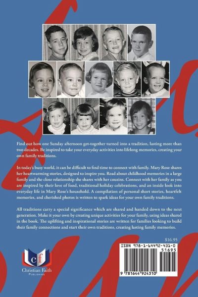 Find out how one Sunday afternoon get-together turned into a tradition, lasting more than two decades. Be inspired to take your everyday activities into lifelong memories, creating your own family traditions. In today's busy world, it can be difficult to find time to connect with family. Mary Rose shares her heartwarming stories, designed to inspire you. Read about childhood memories in a large family and the close relationship she shares with her cousins. Connect with her family as you are inspired by their love of food, traditional holiday celebrations, and an inside look into everyday life in Mary Rose's household. A compilation of personal short stories, heartfelt memories, and cherished photos is written to spark ideas for your own family traditions. All traditions carry a special significance which are shared and handed down to the next generation. Make it your own by creating unique activities for your family, using ideas shared in the book. The uplifting and inspirational stories are written for families looking to build their family connections and start their own traditions, creating lasting family memories.