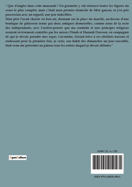 " Que d¿angles dans cette mansarde ! Un géomètre y eût retrouvé toutes les figures du cours le plus complet, mais c¿était mon premier domicile de libre garçon, et j¿en pris possession avec un orgueil, une joie indicibles. Mon père l¿avait choisie en bon air, donnant sur la place du marché, au-dessus d¿une boutique de pâtisserie tenue par deux antiques demoiselles, comme nous de la secte des indépendants, avec l¿arrière-pensée que ma conduite et mes principes religieux seraient sévèrement contrôlés par les misses Dinah et Hannah Dawson, en compagnie de qui je devais prendre mes repas. Lui-même, faisant trêve à ses obstinés travaux et endossant pour la première fois, je crois, son habit des dimanches un jour ouvrable, était venu me présenter au patron sous les ordres duquel je devais débuter."