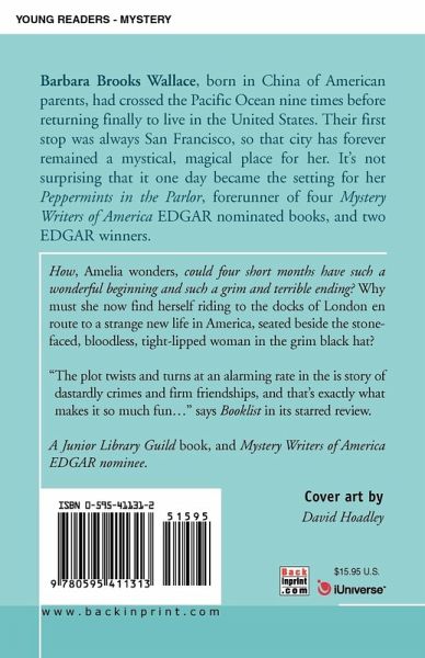 How, Amelia wonders, could four short months have such a wonderful beginning and such a grim and terrible ending? Why must she now find herself riding to the docks of London en route to a strange new life in America, seated beside the stone-faced, bloodless, tight-lipped woman in the grim black hat? "The plot twists and turns at an alarming rate in the is story of dastardly crimes and firm friendships, and that's exactly what makes it so much fun." says Booklist in its starred review. A Junior Library Guild book, and Mystery Writers of America EDGAR nominee.
