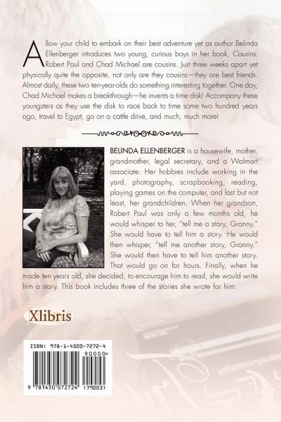 Allow your child to embark on their best adventure yet as author Belinda Ellenberger introduces two young, curious boys in her book, Cousins. Robert Paul and Chad Michael are cousins. Just three weeks apart yet physically quite the opposite, not only are they cousins-they are best friends. Almost daily, these two ten-year-olds do something interesting together. One day, Chad Michael makes a breakthrough-he invents a time disk! Accompany these youngsters as they use the disk to race back to time some two hundred years ago, travel to Egypt, go on a cattle drive, and much, much more!