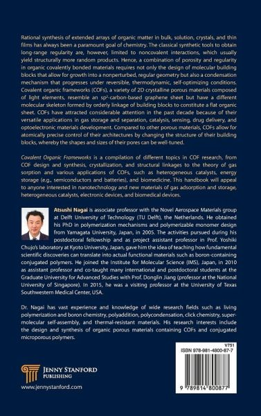 This book is a compilation of different topics of COF research, from COF design and synthesis, crystallization, and structural linkages, to the theory of gas sorption and various applications such as heterogeneous catalysts and energy storage (e.g., semiconductors and batteries).