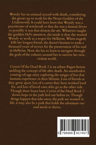 Wendy has an unusual accord with death, considering she grows up to work for the Norse Goddess of the Underworld. It could have been that Wendy was a practitioner of witchcraft or that she was a funeral driver or possibly it was that demon she ate. Whatever caught the goddess Hel's attention, she made it clear she wanted Wendy to work as a reaper for Helheim. When tragedy kills her longest friend, she doesn't hesitate to trade a thousand years of service for the preservation of his soul in Helheim. Now she has to learn to navigate through the gods of the cultures around her to survive her new, violent world. Coven Of the Dead Book 2 is an urban-Pagan fiction tackling the concept of life after death. An unorthodox coming-of-age story exploring the ranges of loss that humans experience in their lifetime. Loss of friends as they grow apart, loss of a career they have worked hard for, and loss of loved ones who go to the other side. Though these losses hurt, Coven of the Dead Book 2 shows hope in the path laid out before us. Though things happen that take away the path we wanted in life, it may also be a path that holds the adventure our soul needs to thrive.