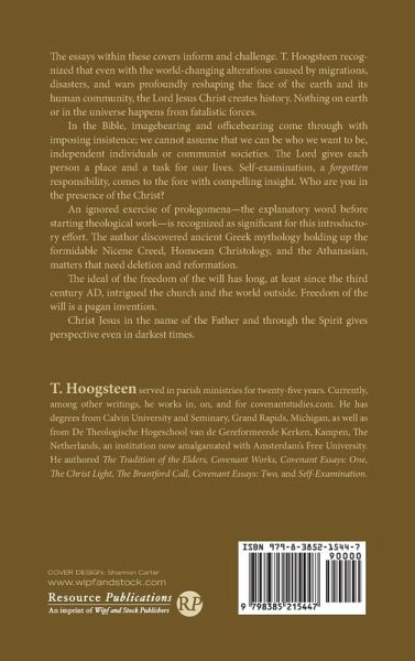 The essays within these covers inform and challenge. T. Hoogsteen recognized that even with the world-changing alterations caused by migrations, disasters, and wars profoundly reshaping the face of the earth and its human community, the Lord Jesus Christ creates history. Nothing on earth or in the universe happens from fatalistic forces. In the Bible, imagebearing and officebearing come through with imposing insistence; we cannot assume that we can be who we want to be, independent individuals or communist societies. The Lord gives each person a place and a task for our lives. Self-examination, a forgotten responsibility, comes to the fore with compelling insight. Who are you in the presence of the Christ? An ignored exercise of prolegomena--the explanatory word before starting theological work--is recognized as significant for this introductory effort. The author discovered ancient Greek mythology holding up the formidable Nicene Creed, Homoean Christology, and the Athanasian, matters that need deletion and reformation. The ideal of the freedom of the will has long, at least since the third century AD, intrigued the church and the world outside. Freedom of the will is a pagan invention. Christ Jesus in the name of the Father and through the Spirit gives perspective even in darkest times.