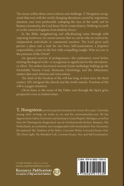 The essays within these covers inform and challenge. T. Hoogsteen recognized that even with the world-changing alterations caused by migrations, disasters, and wars profoundly reshaping the face of the earth and its human community, the Lord Jesus Christ creates history. Nothing on earth or in the universe happens from fatalistic forces. In the Bible, imagebearing and officebearing come through with imposing insistence; we cannot assume that we can be who we want to be, independent individuals or communist societies. The Lord gives each person a place and a task for our lives. Self-examination, a forgotten responsibility, comes to the fore with compelling insight. Who are you in the presence of the Christ? An ignored exercise of prolegomena--the explanatory word before starting theological work--is recognized as significant for this introductory effort. The author discovered ancient Greek mythology holding up the formidable Nicene Creed, Homoean Christology, and the Athanasian, matters that need deletion and reformation. The ideal of the freedom of the will has long, at least since the third century AD, intrigued the church and the world outside. Freedom of the will is a pagan invention. Christ Jesus in the name of the Father and through the Spirit gives perspective even in darkest times.