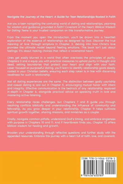 Navigate the Journey of the Heart: A Guide for Teen Relationships Rooted in Faith Are you a teen navigating the confusing world of dating and relationships, yearning for wisdom and guidance grounded in faith? Covenant of the Heart: Biblical Wisdom for Dating Teens is your trusted companion on this transformative journey. From the moment you open the introduction, you'll be drawn into a heartfelt exploration of the essence of relationships as designed by God. Discover the true meaning of love through scripture in Chapter 2, delving into how Christ's love provides the ultimate model beyond fleeting emotions. This book isn't just about feelings; it's about making choices that reflect a covenantal heart. Lines get easily blurred in a world that often overlooks the principles of purity. Chapters 3 and 4 equip you with practical measures to uphold purity in thought and deed, setting boundaries that protect your heart and align with your faith. Laser-focused on purposeful dating, you'll learn to identify relationship goals deeply rooted in your Christian beliefs, ensuring each step taken is in line with discerning readiness for such a relationship. Not all dating experiences are the same. The distinction between godly courtship and casual dating is laid out in Chapter 5, encouraging mutual honor with intent and integrity. Effective communication is the bedrock of any relationship, explored in-depth in Chapter 6, alongside practical advice on speaking truth in love and mastering active listening. Every relationship faces challenges, but Chapters 7 and 8 guide you through resolving conflicts biblically and understanding the influence of community and fellowship. As you grow deeper in your relationship, Chapter 9 helps cultivate spiritual growth together, sharing missions, and ministries as a couple. Finally, navigate common pitfalls, understand God's timing, and embrace singleness with purpose in Chapters 10 and 11. And if heartbreak finds you, Chapter 12 offers biblical wisdom for healing and growth. Broaden your understanding through reflective questions and further study with the appended resources. Embrace this journey with a heart full of faith, love, and covenant.