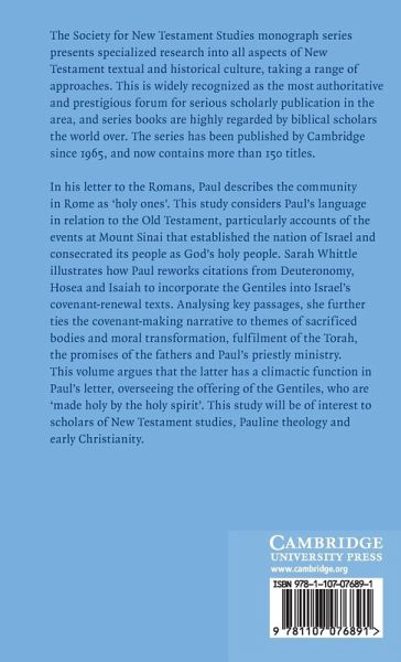 In his letter to the Romans, Paul describes the community in Rome as 'holy ones'. This study considers Paul's language in relation to the Old Testament, particularly accounts of the events at Mount Sinai that established the nation of Israel and consecrated its people as God's holy people. Sarah Whittle illustrates how Paul reworks citations from Deuteronomy, Hosea, and Isaiah to incorporate the Gentiles into Israel's covenant-renewal texts. Analysing key passages, she further ties the covenant-making narrative to themes of sacrificed bodies and moral transformation, fulfilment of the Torah, the promises of the fathers, and Paul's priestly ministry. This volume argues that the latter has a climactic function in Paul's letter, overseeing the offering of the Gentiles, who are 'made holy by the holy spirit'. This study will be of interest to scholars of New Testament studies, Pauline theology, and early Christianity.